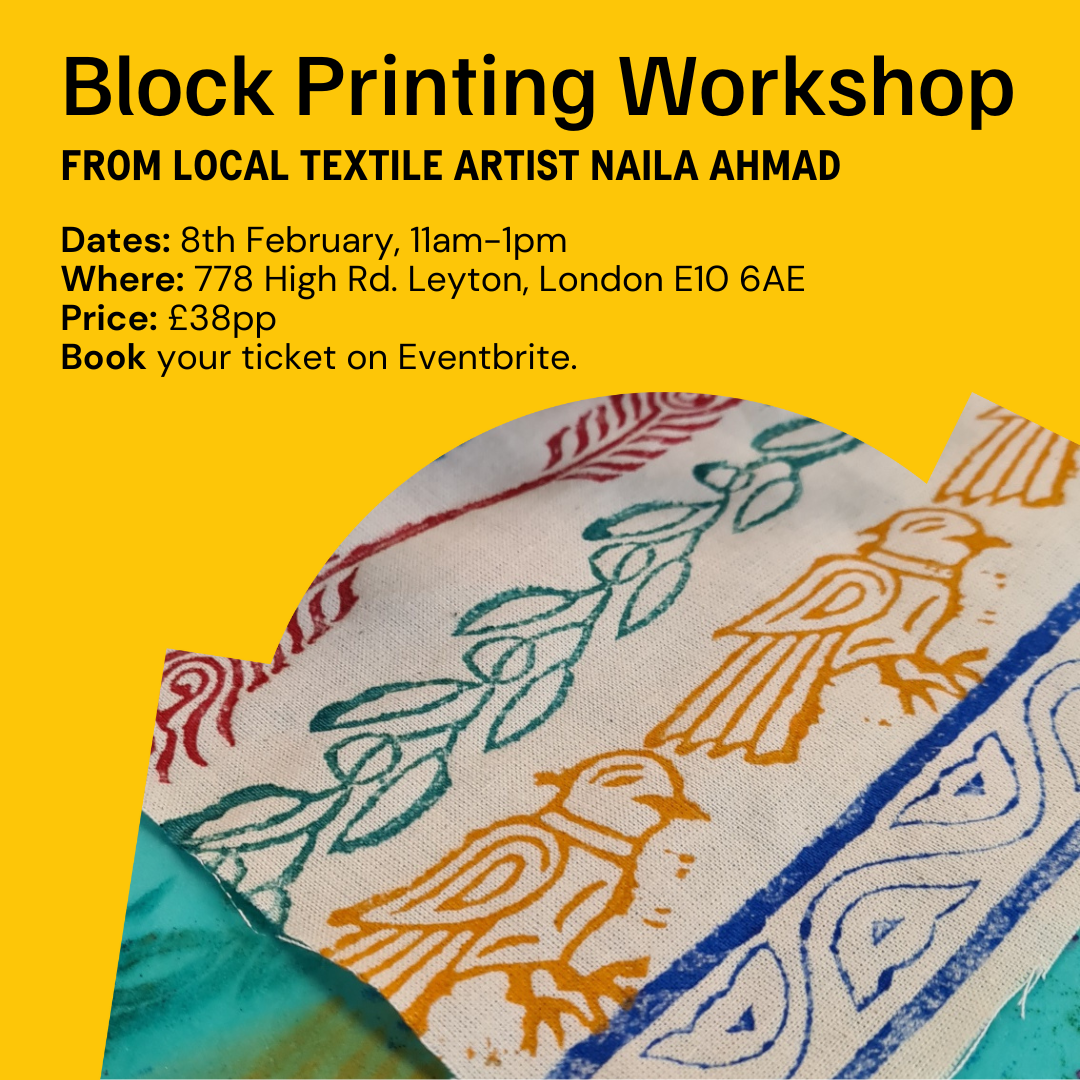 Join us this Saturday, 8th Feb (11am–1pm) at Leyton Green Studios for a relaxed, hands-on session of block printing on tea towels and tote bags. Local textile artist Naila Ahmad (expertise since 2016!) will guide you through the process - no experience needed. Bring a friend or come solo, enjoy light refreshments, and leave with your own unique creations.