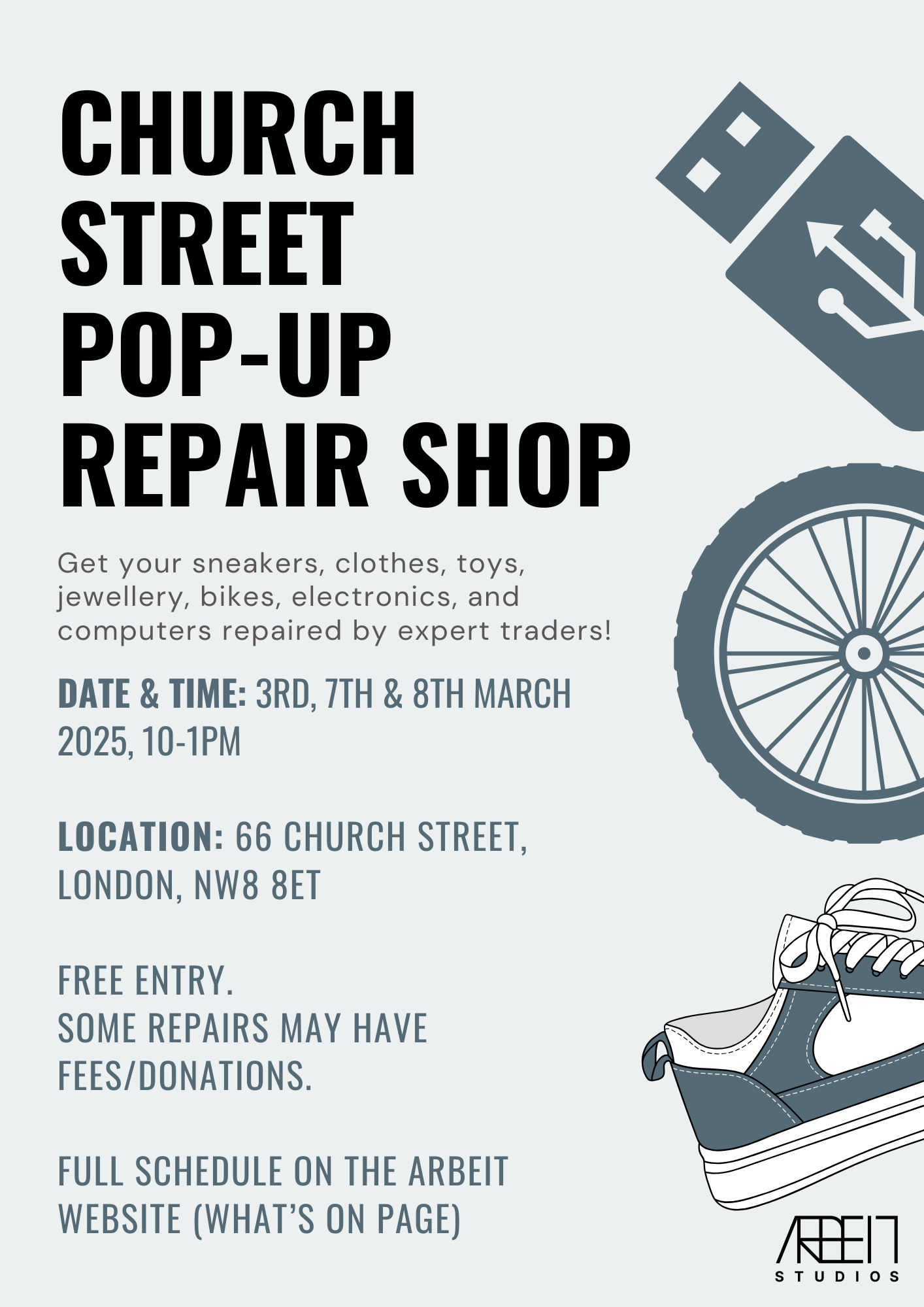Join us on 3rd, 7th & 8th March 2025 (10 AM - 1 PM) at 66 Church Street, London, NW8 8ET, where expert traders will be on hand to repair your sneakers, clothes, jewellery, bikes, electronics, and more.